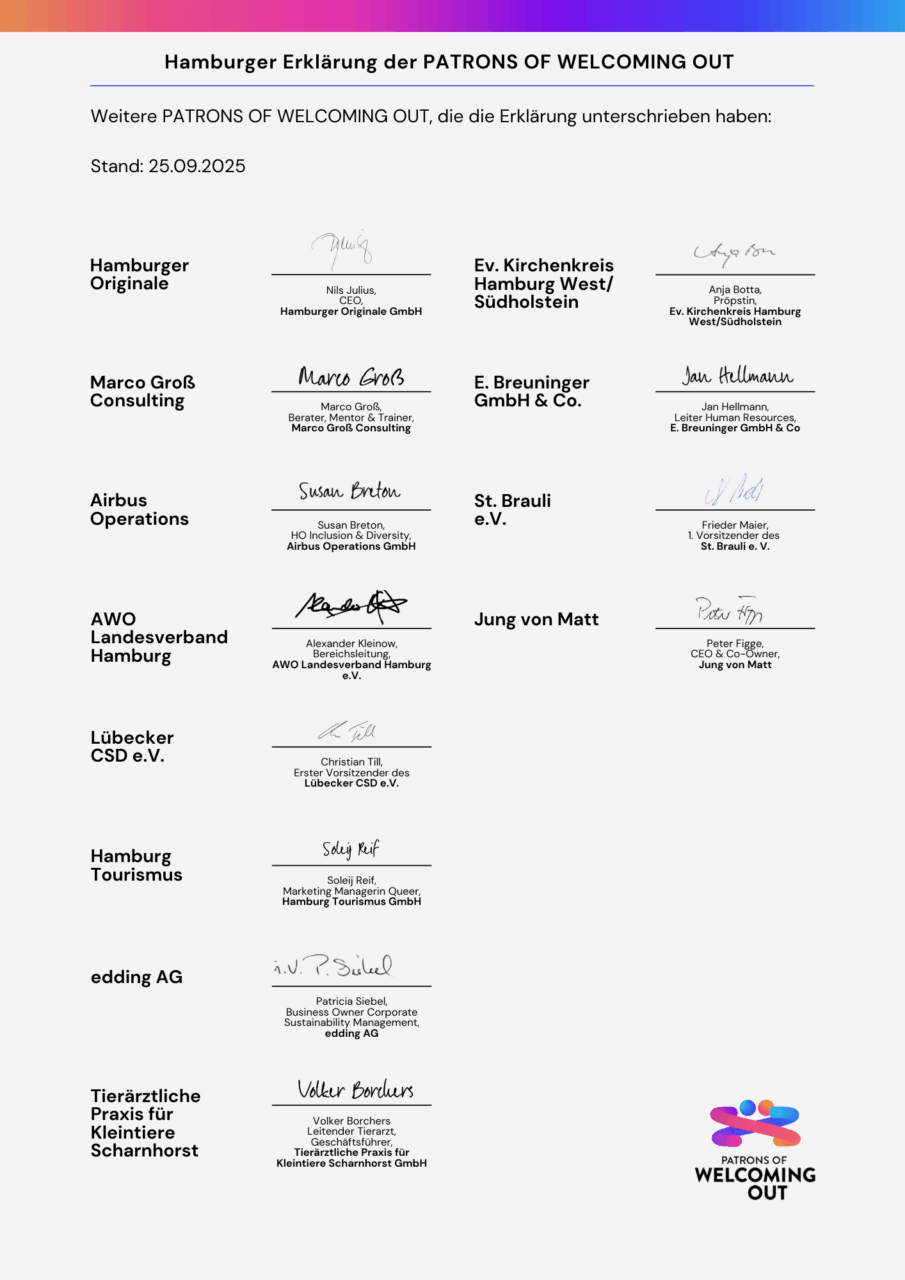 Ebenso rufen wir weitere Organisationen dazu auf das WELCOMING OUT-Movement nachhaltig zu stärken, indem sie sich unserem Bündnis der „PATRONS OF WELCOMING OUT“ anschließen.