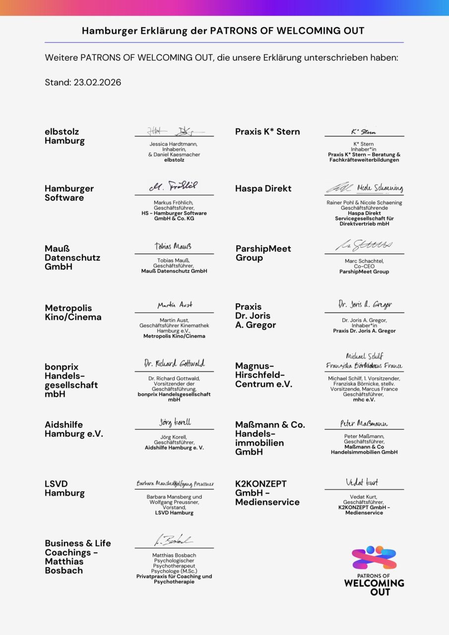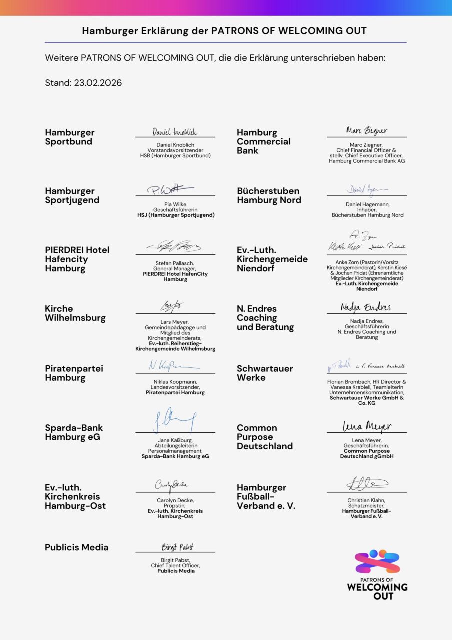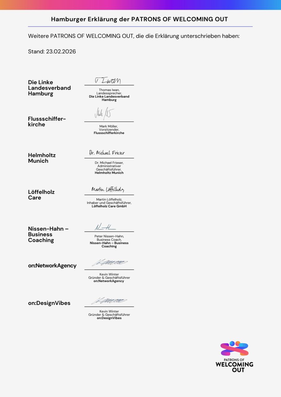 Alle PATRONS unterschreiben die Hamburger Erklärung der PATRONS OF WELCOMING OUT. Diese Erklärung benennt das Selbstverständnis und die Werte des Bündnisses und stellt eine klare Positionierung der unterzeichnenden Organisationen dar.